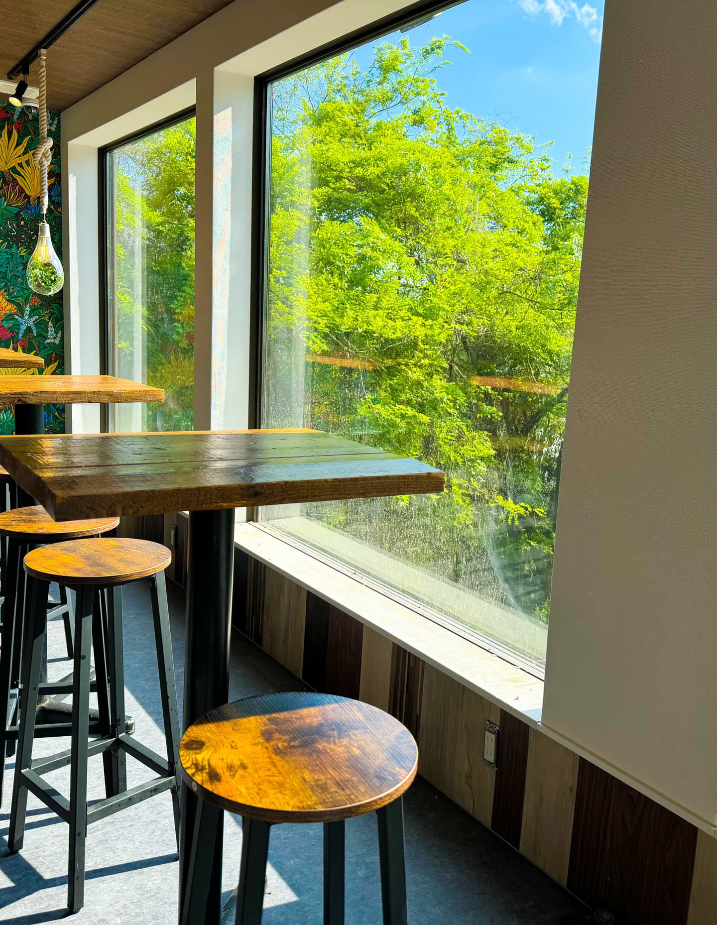 森のカフェでは、どちらの席でもあたたかな木漏れ日と、時々訪れる小鳥のさえずりを感じていただけます。店内、テラス席ともに十分な席数をご用意しておりますので、いつでもお気軽にお立ち寄りください。